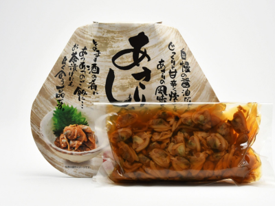 この「あさりのしぐれ煮」は、貝の形をしたかわいらしいパッケージが印象的な、柔らかく炊き上げた逸品です!自慢の醤油だれと、しょうがの風味が絶妙にマッチし、甘辛く炊き